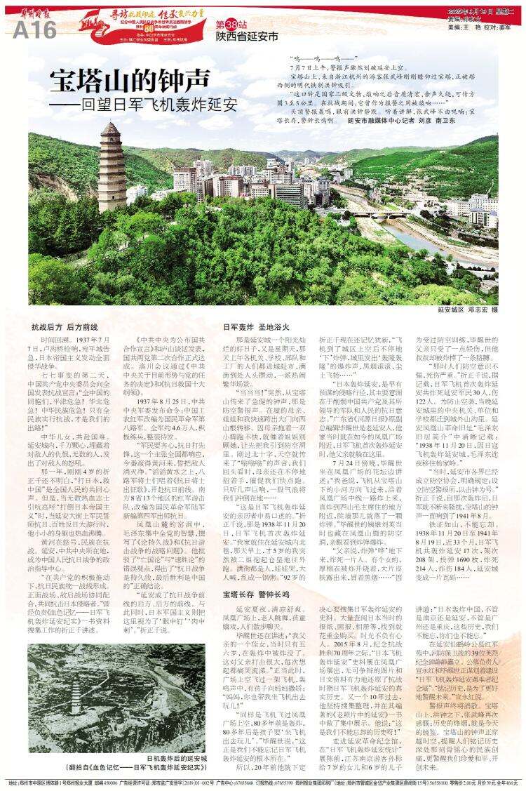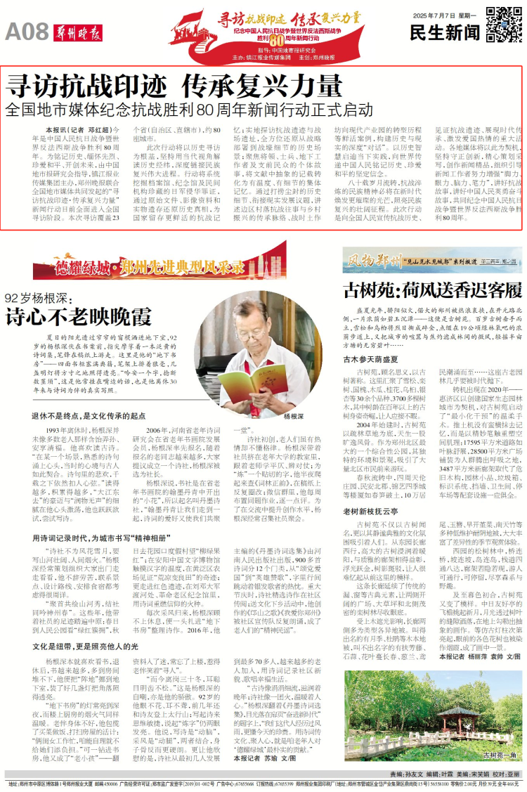 今年是中国人民抗日战争暨世界反法西斯战争胜利80周年。为铭记历史、缅怀先烈、珍爱和平、开创未来,由中国地市报研究会指导,镇江报业传媒集团主办,郑州晚报联合全国地市媒体共同发起的“寻访抗战印迹·传承复兴力量”新闻行动日前全面进入全国寻访阶段。本次寻访覆盖23个省(自治区、直辖市),约80座城市。